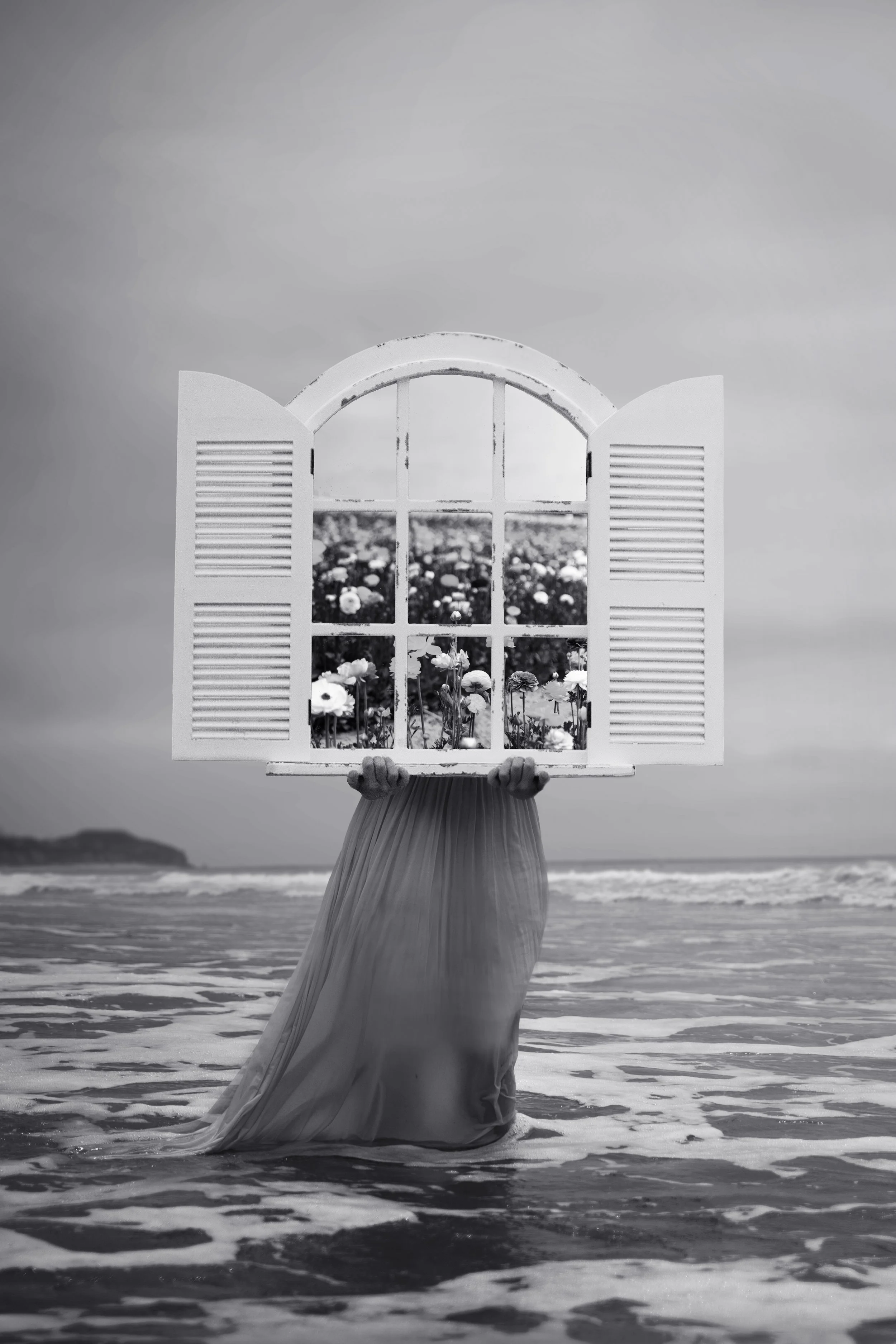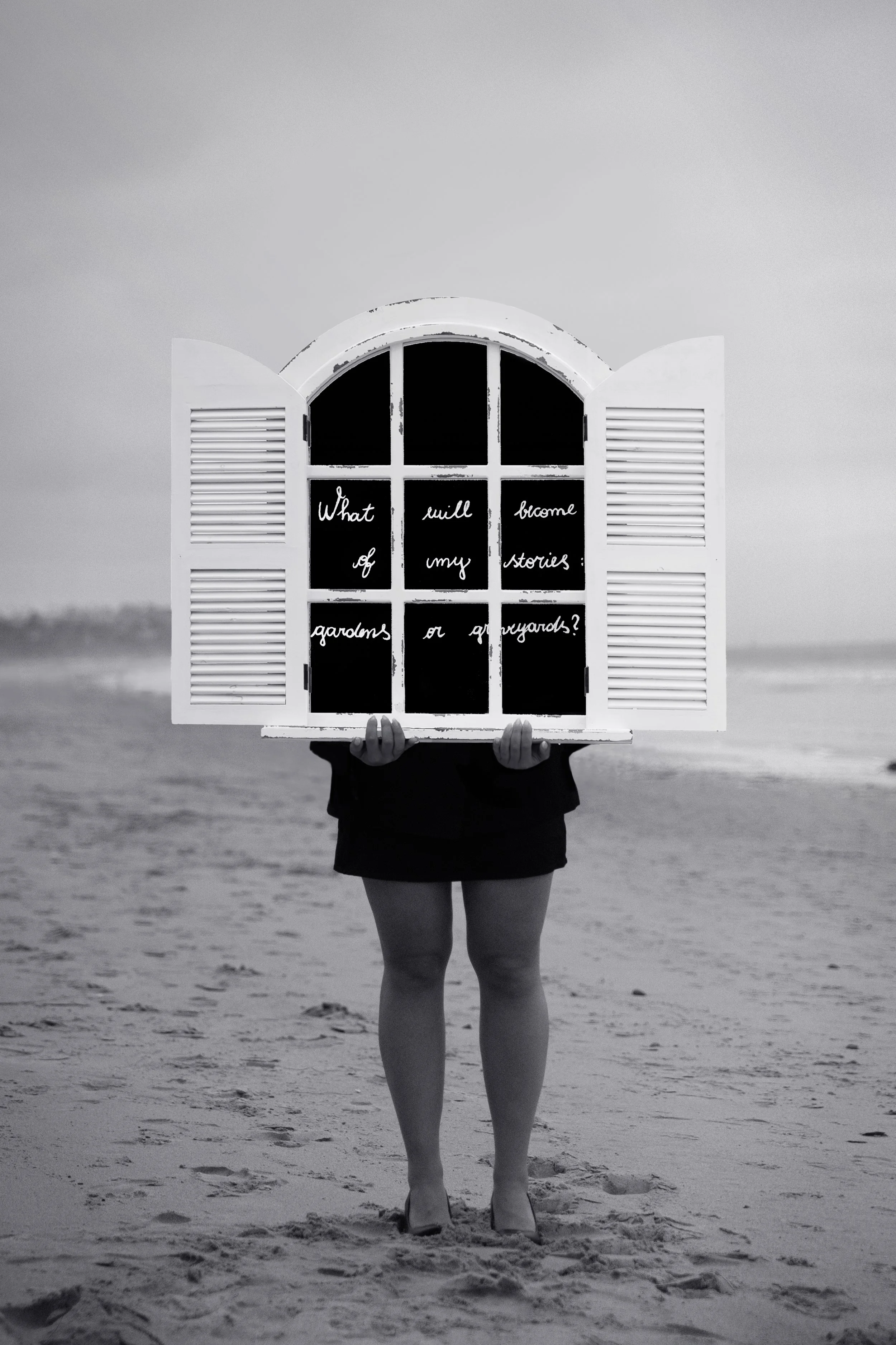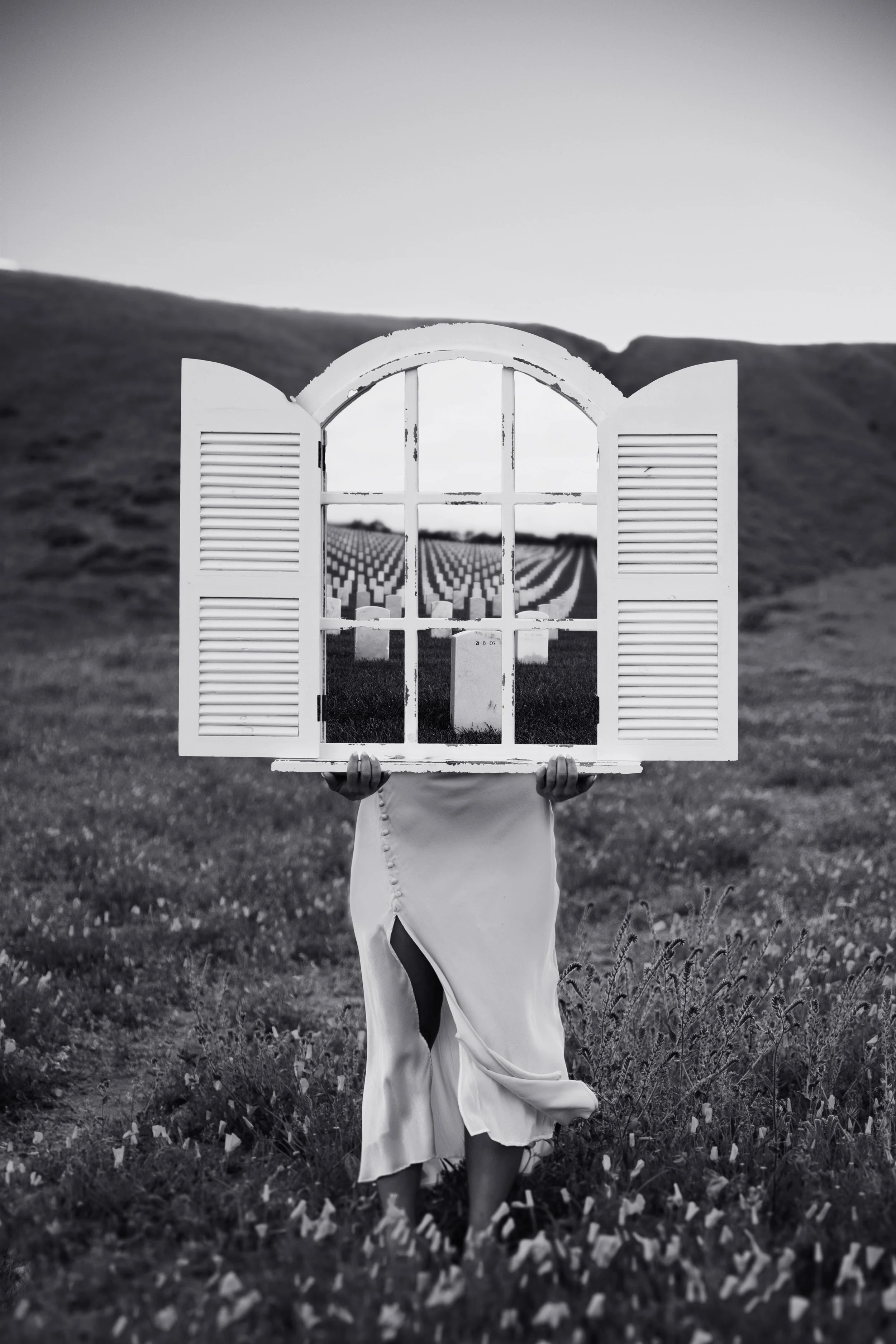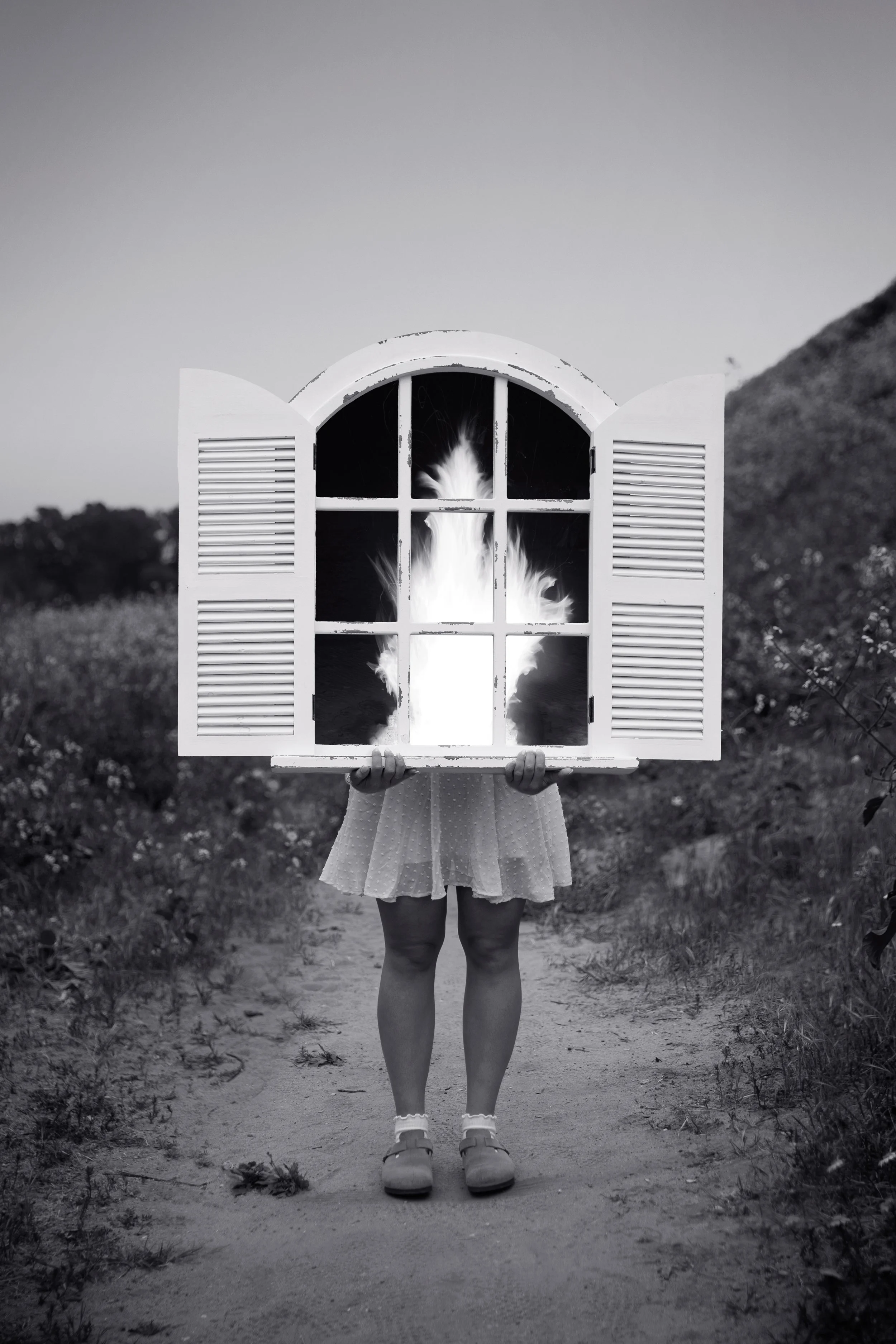 Windows of the Soul invites viewers into an intimate confrontation with selfhood. At the center of each image stands a figure holding a window—both a literal object and a metaphorical threshold. Through these windows, glimpses of inner worlds are revealed: fire, graveyards, emptiness, and in one, the handwritten question, “What will become of my stories: gardens or graveyards?” The series explores the dissonance between external presentation and internal reality, raising questions about what we choose to share, what we choose to hide, and what remains even beyond our choices.